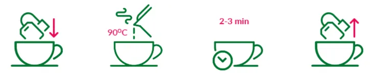 Sposób przygotowania: 1 saszetkę zalać szklanką (250 ml) gorącej wody (90°C). Zaparzać przez 2-3 min.